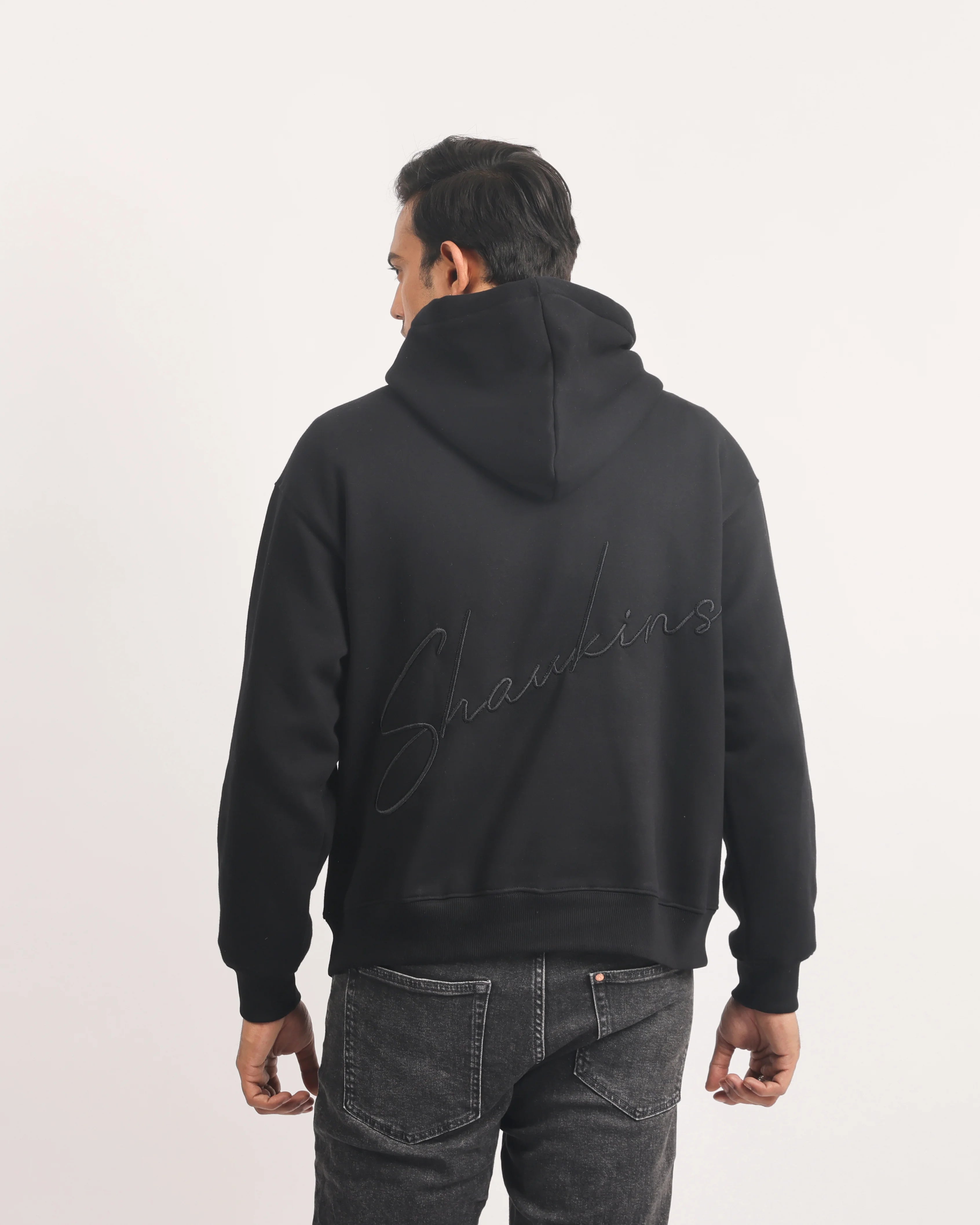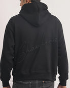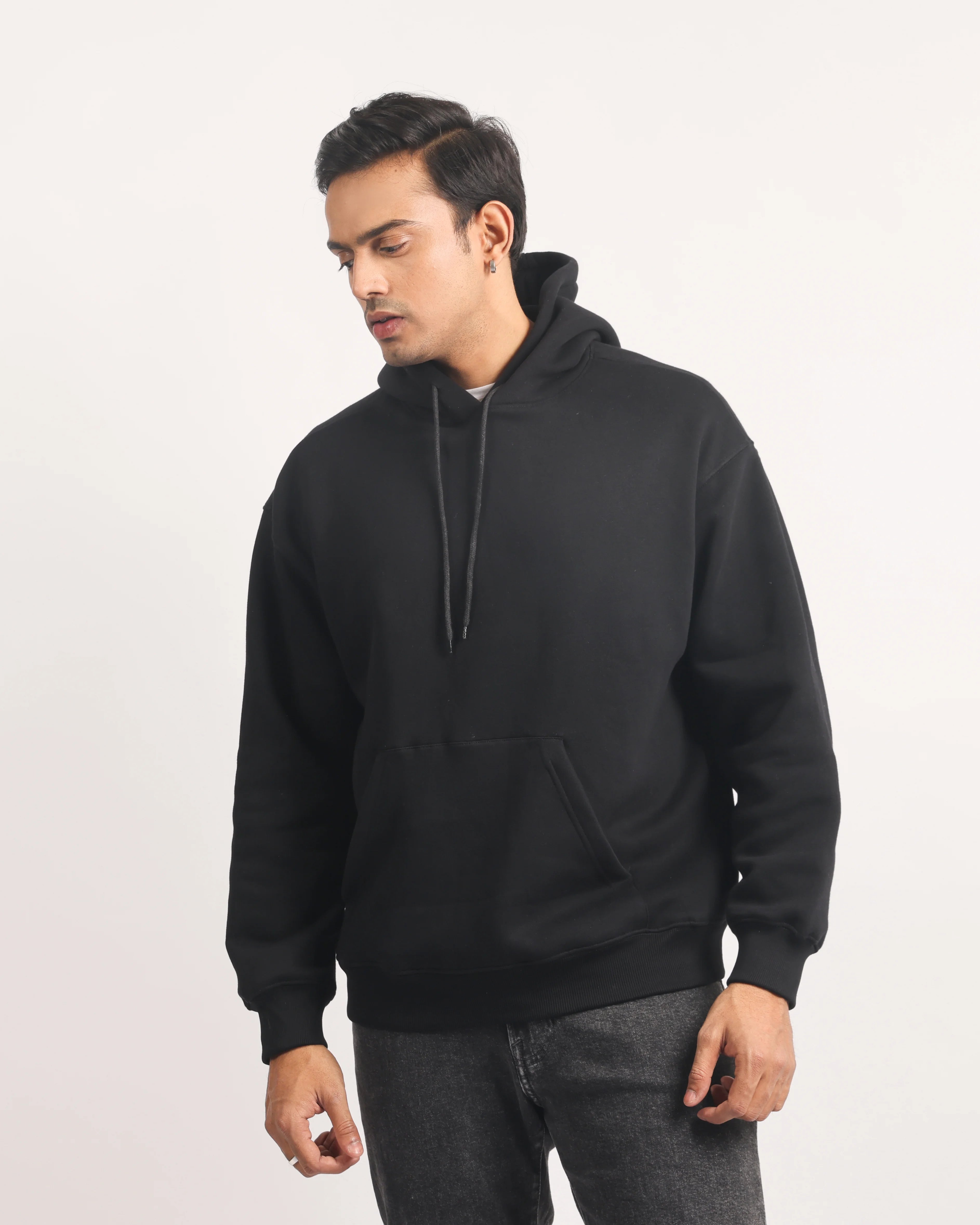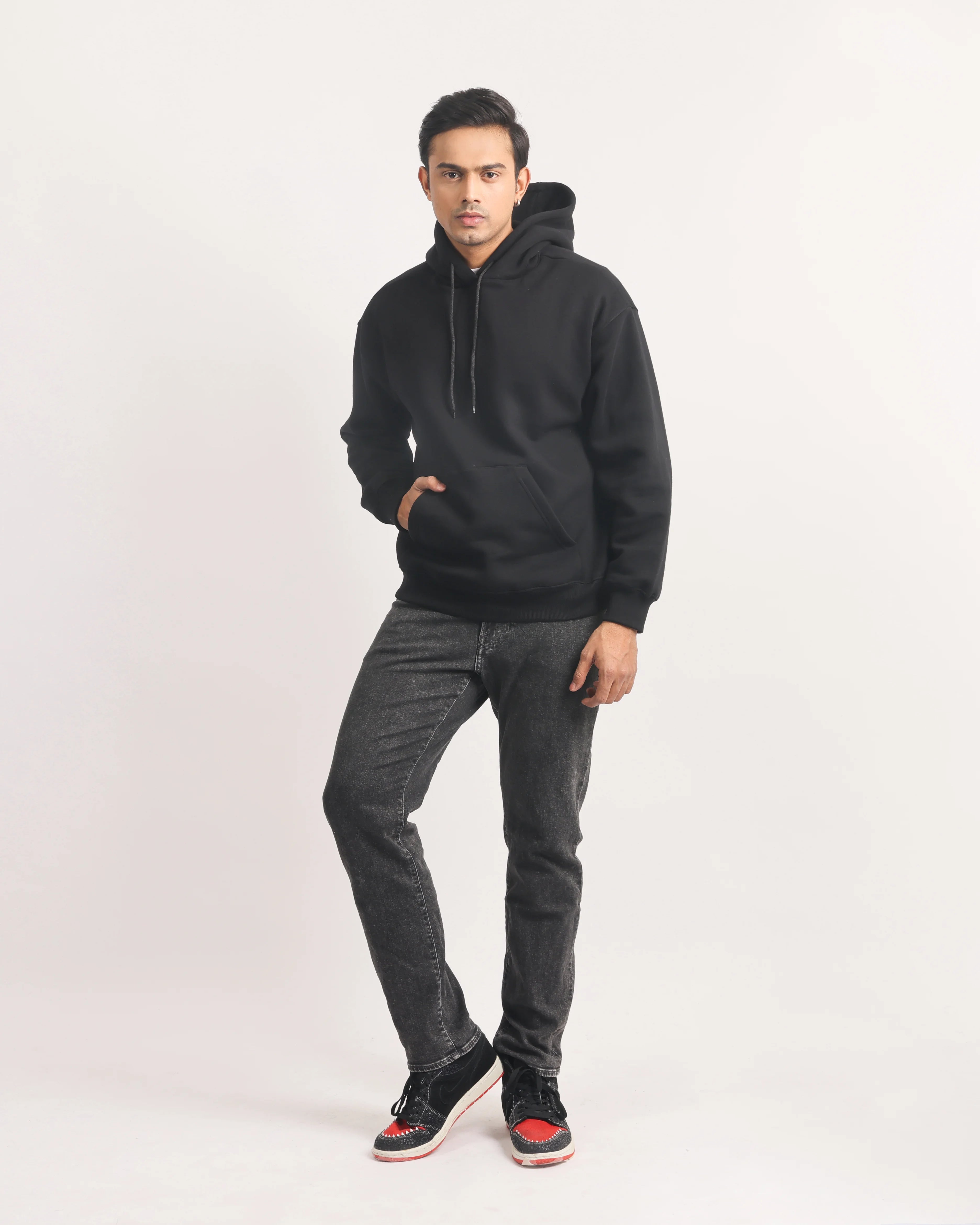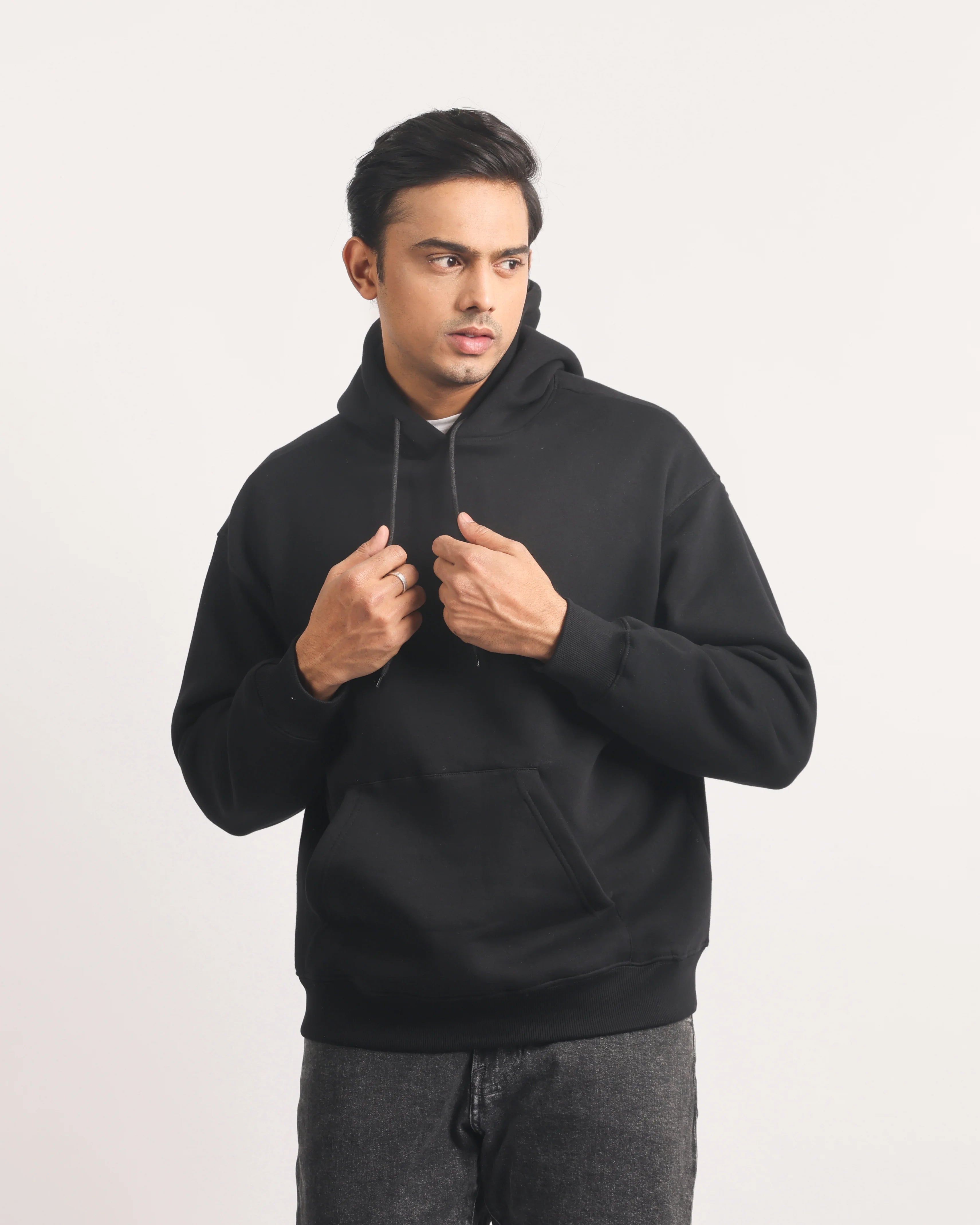 Hoodie in heavyweight (400GSM) sweatshirt fabric made from a cotton blend with a soft brushed inside. Jersey-lined, drawstring hood, dropped shoulders, long sleeves, a kangaroo pocket and wide ribbing at the cuffs and hem. Loose fit for a generous but not oversized silhouette.