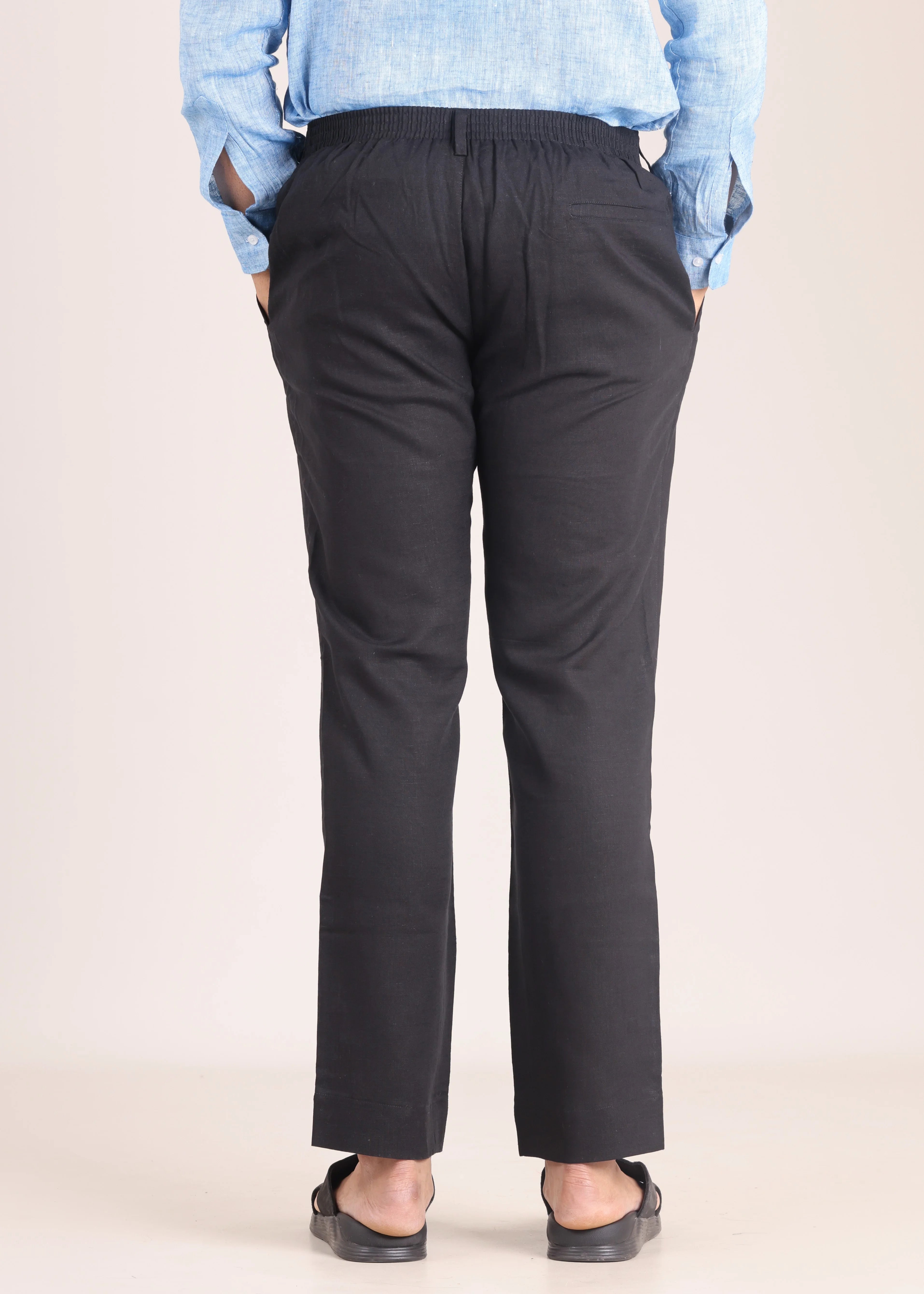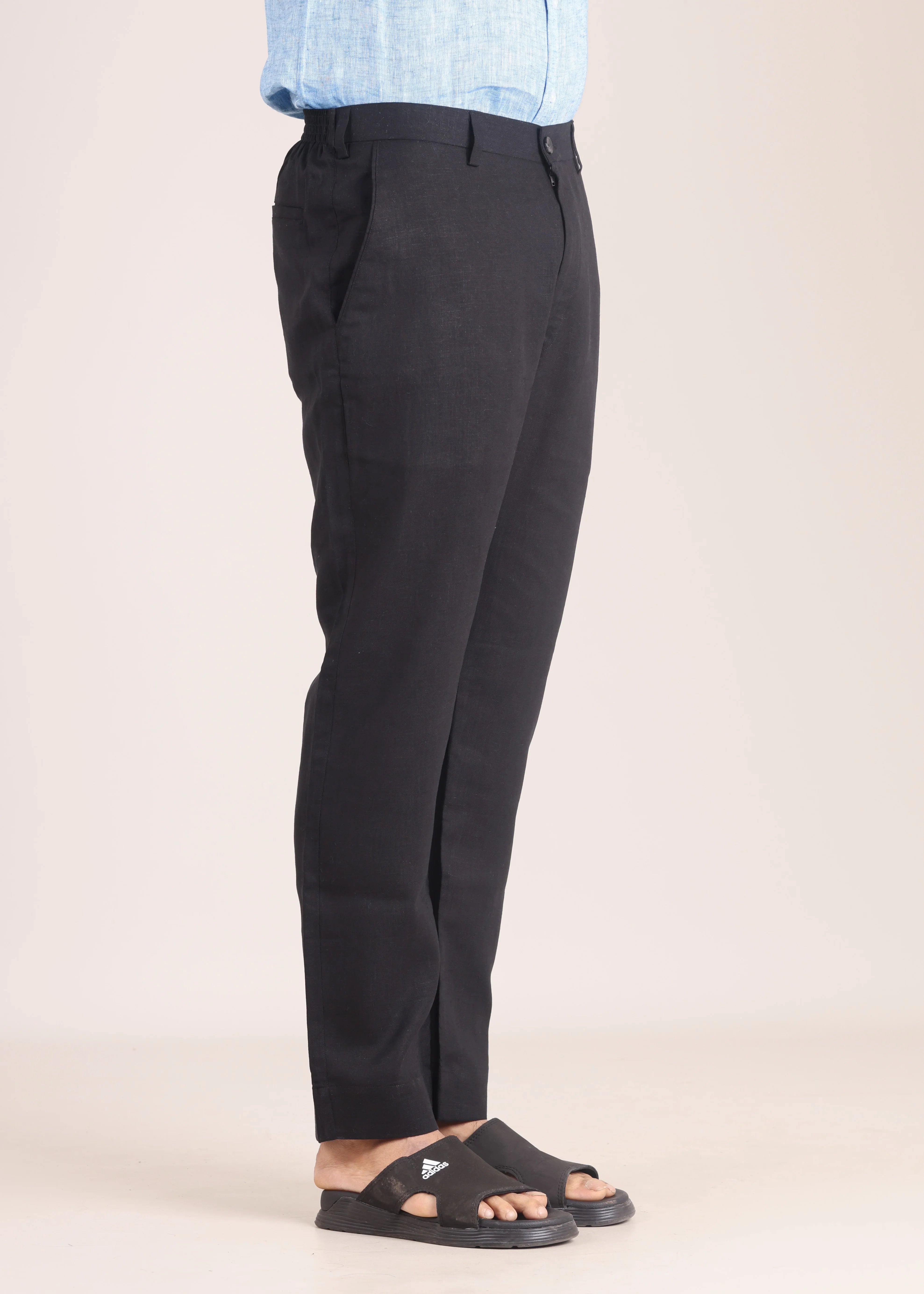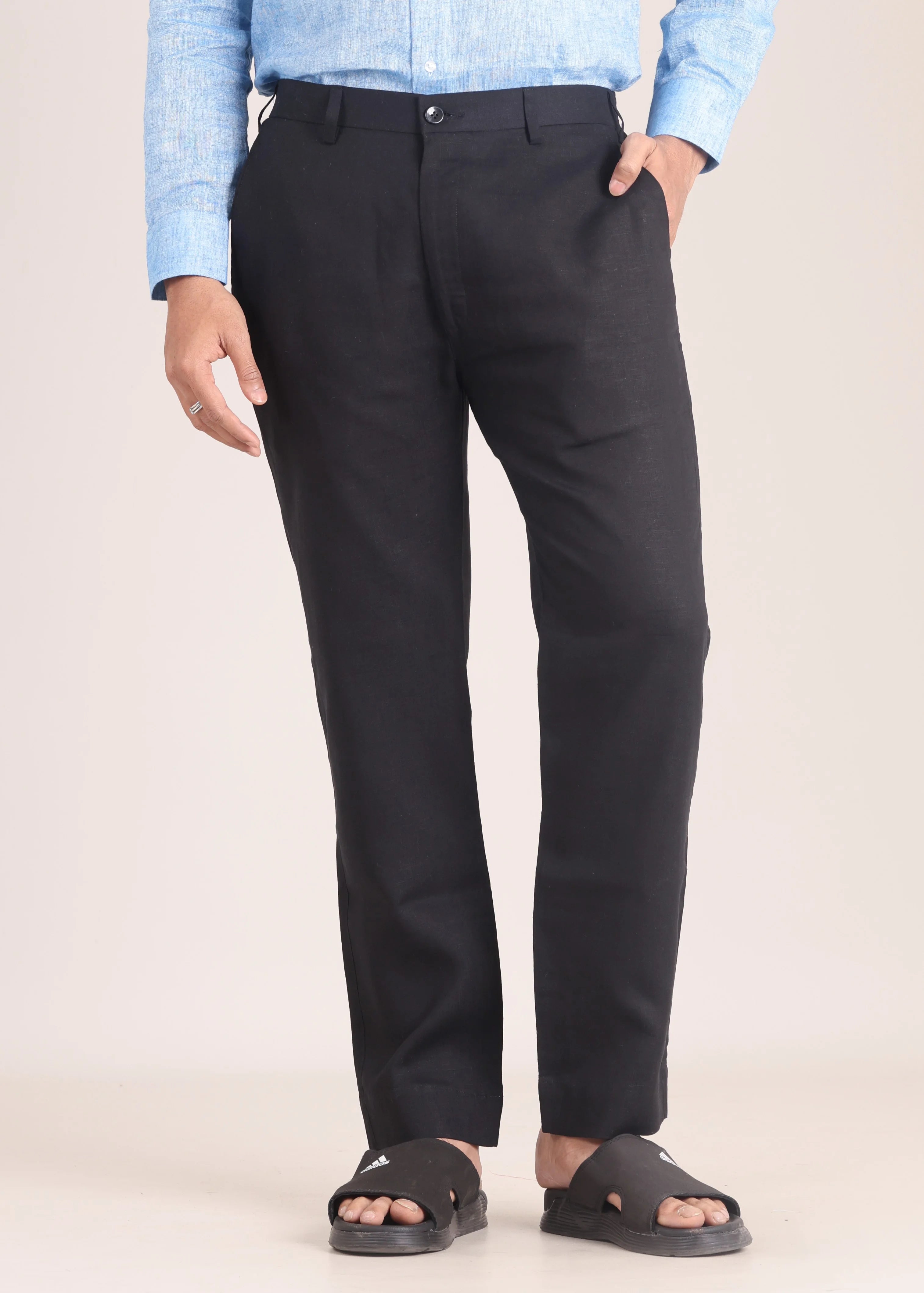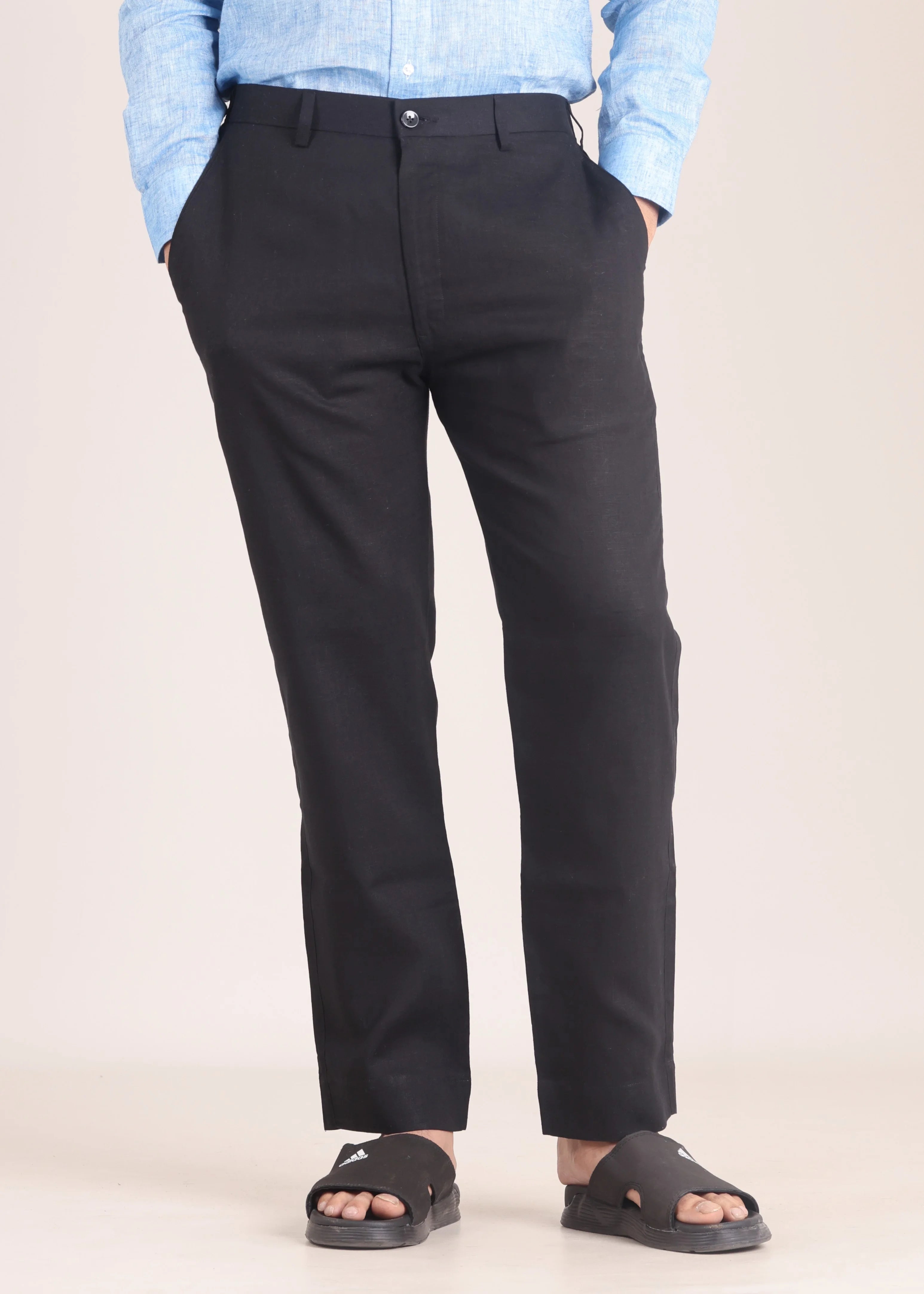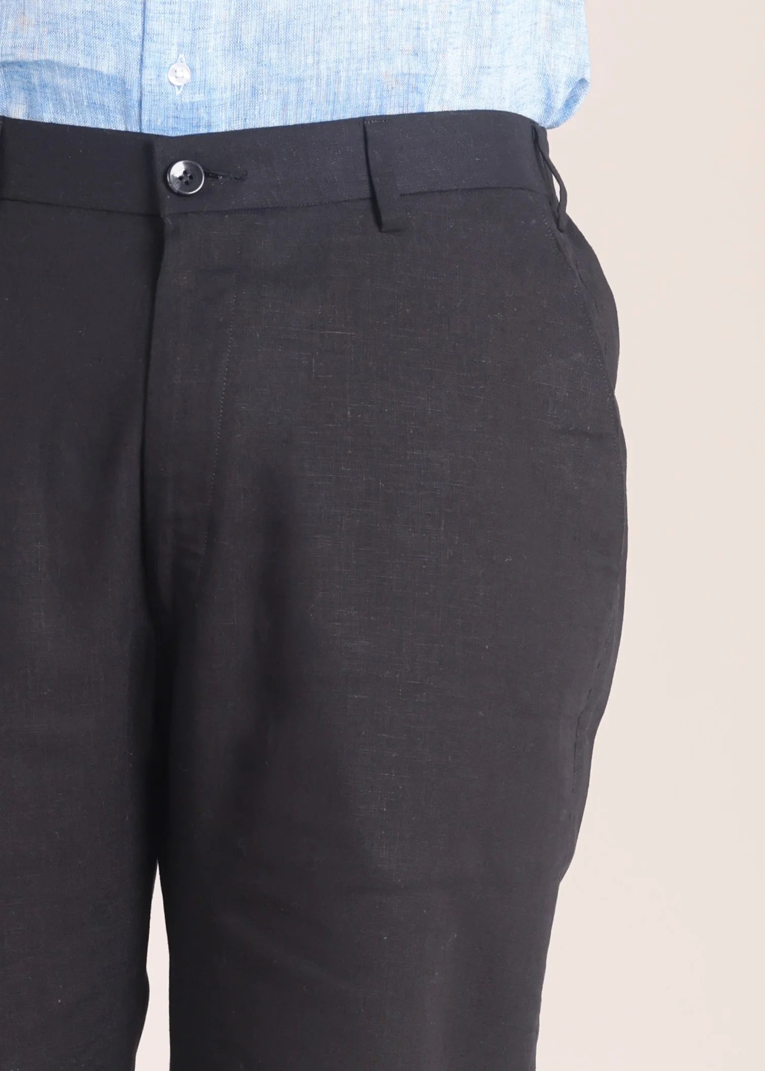 Cotton-linen blend fabric. Regular fit. Smart belt at the front. Half-elasticated waistband at the back for stretch and comfort. Straight, clean silhouette. Belt loops. Double button and zip closure. Two side pockets. Single pockets at the back. The model is 6 feet tall and wears a size 32.