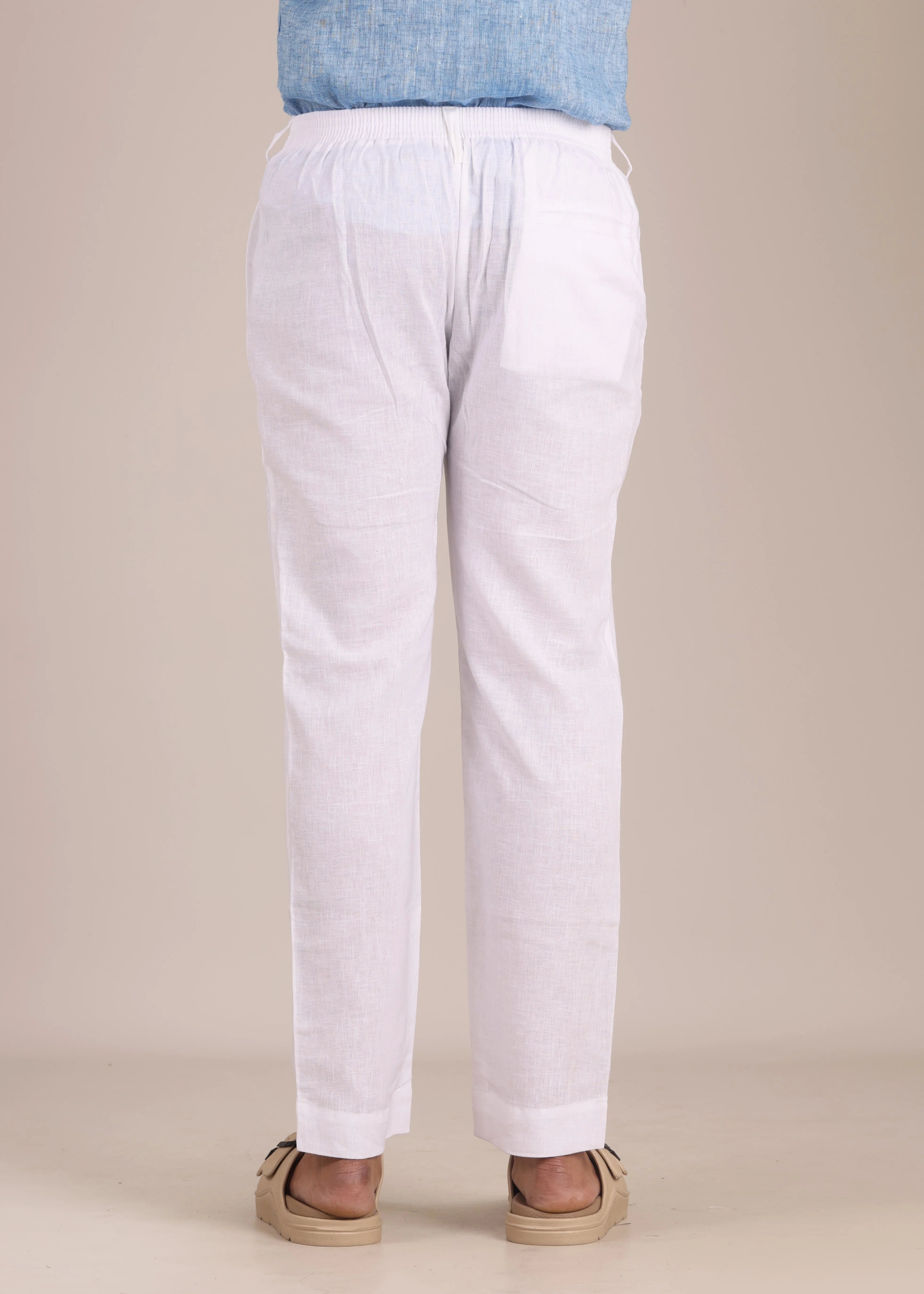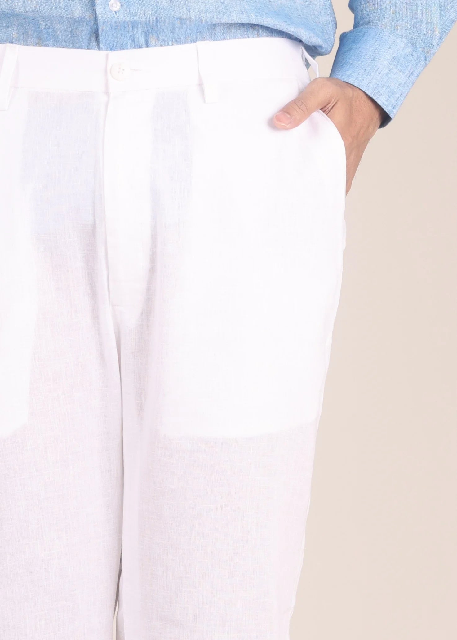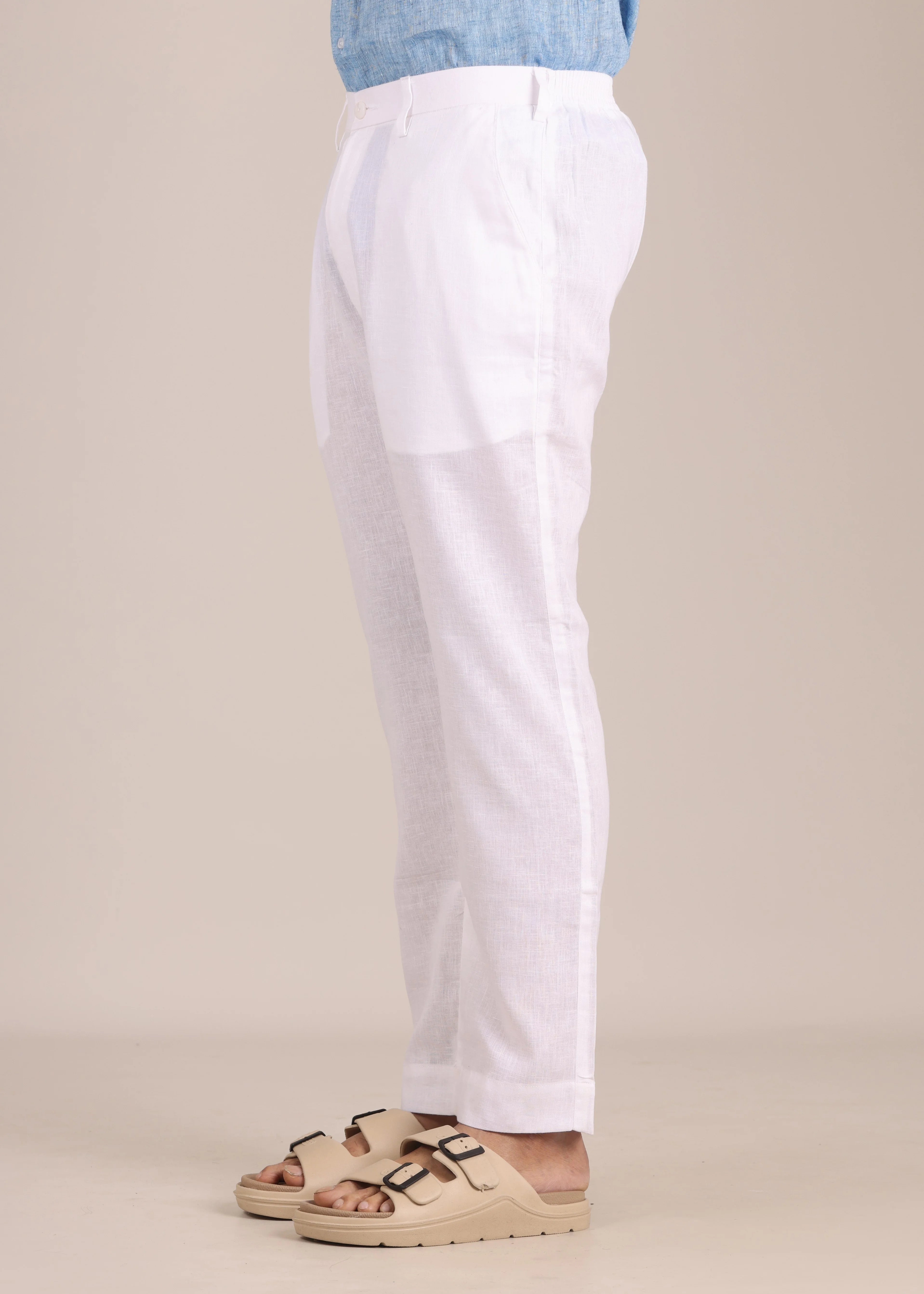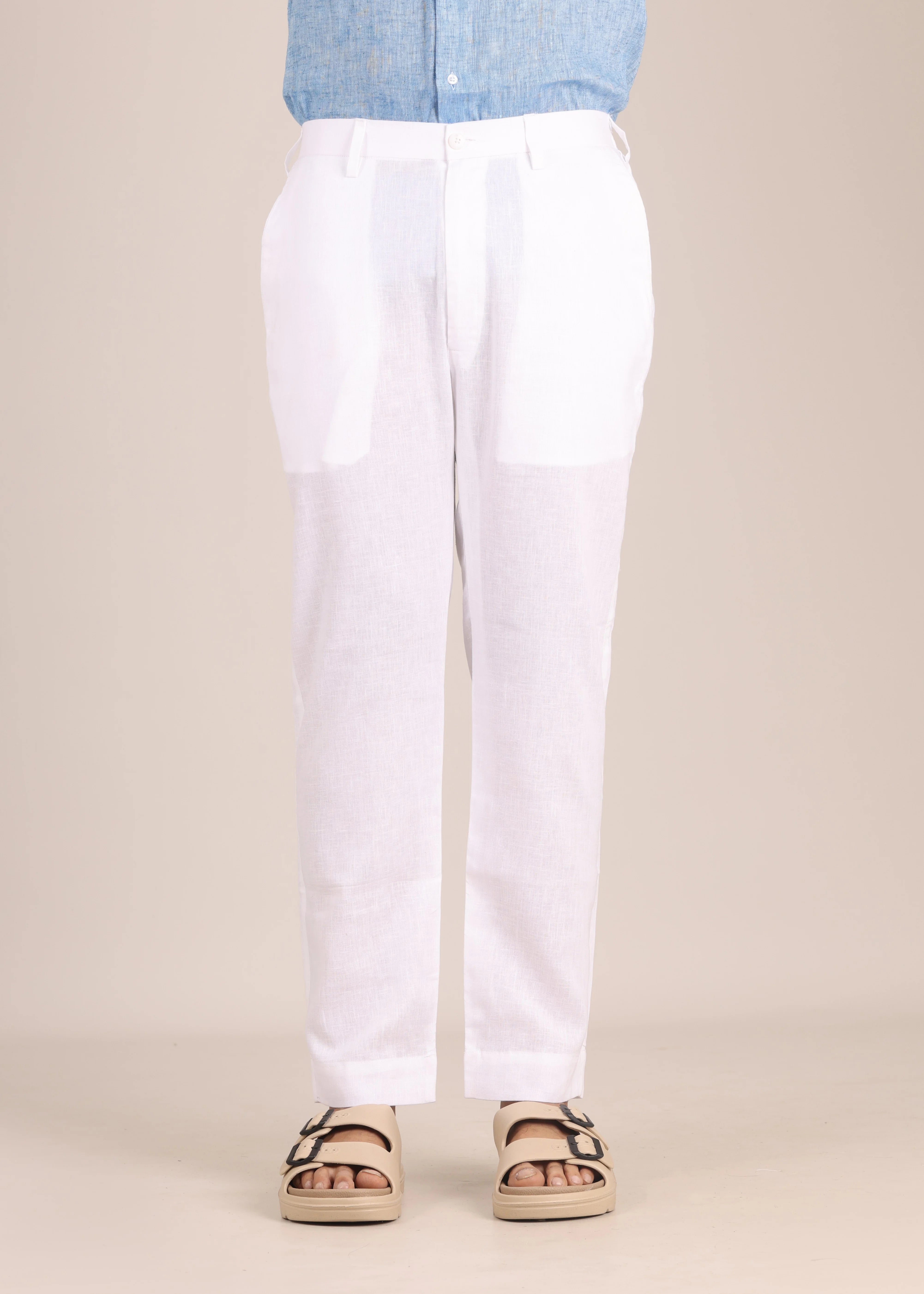 Cotton-linen blend fabric. Regular fit. Smart belt at the front. Half-elasticated waistband at the back for stretch and comfort. Straight, clean silhouette. Belt loops. Double button and zip closure. Two side pockets. Single pockets at the back. The model is 6 feet tall and wears a size 32.